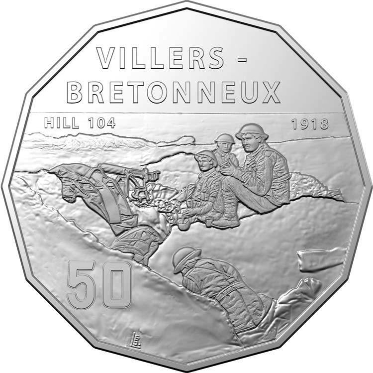 • Coin’s reverse features an artistic representation of Australian soldiers at a machine gun post on Hill 104