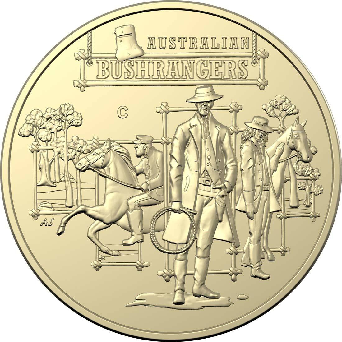 • Coins’ reverse depicts a scene of the classic Australian bushranger and the brave colonial trooper, reflecting the drama and action of the time.