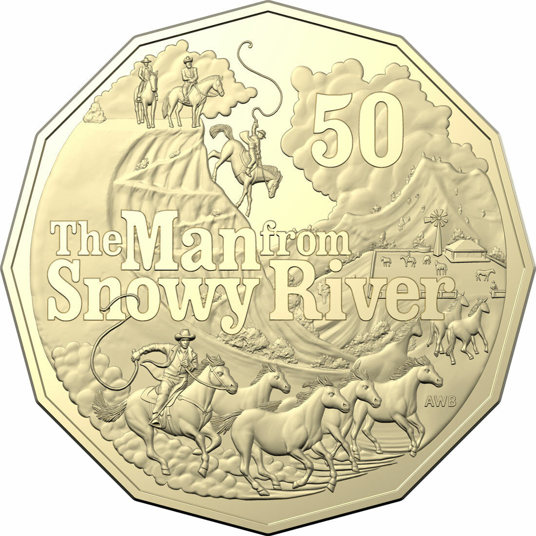 • The reverse of each coin depicts a beloved poem by Paterson: Waltzing Matilda (1895), The Man from Snowy River (1890), and Clancy of the Overflow (1889)