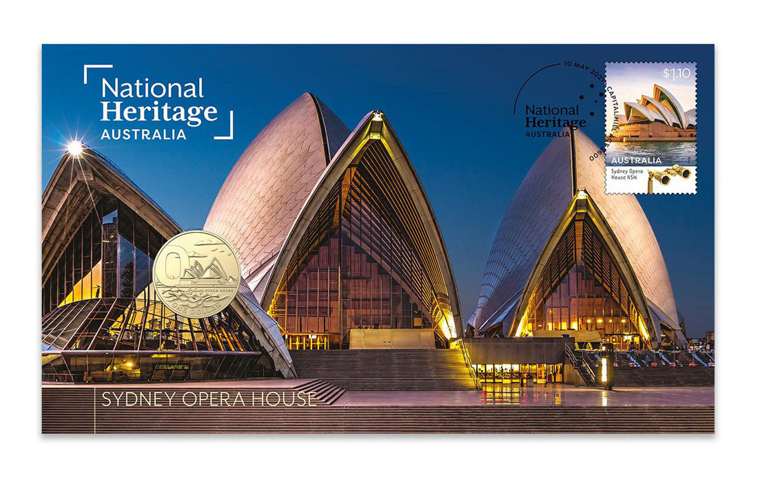 The Sydney Opera House Postal Numismatic Cover is highly collectable, featuring a pictorial envelope with the Sydney Opera House stamp from the World Heritage Australia stamp issue (20/10/2021) and a coin from the Royal Australian Mint. The stamp is postmarked - 10 May 2021 | Capital Hill ACT 2600