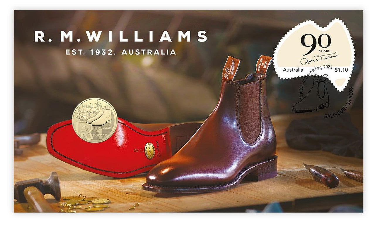 With the release of the R.M. Williams postal numismatic cover we are celebrating 90 years of Australia’s premier producer of quality leather boots, accessories and functional apparel. The stamp area label is postmarked - First day of issue | 9 May 2022 | Salisbury SA 5108