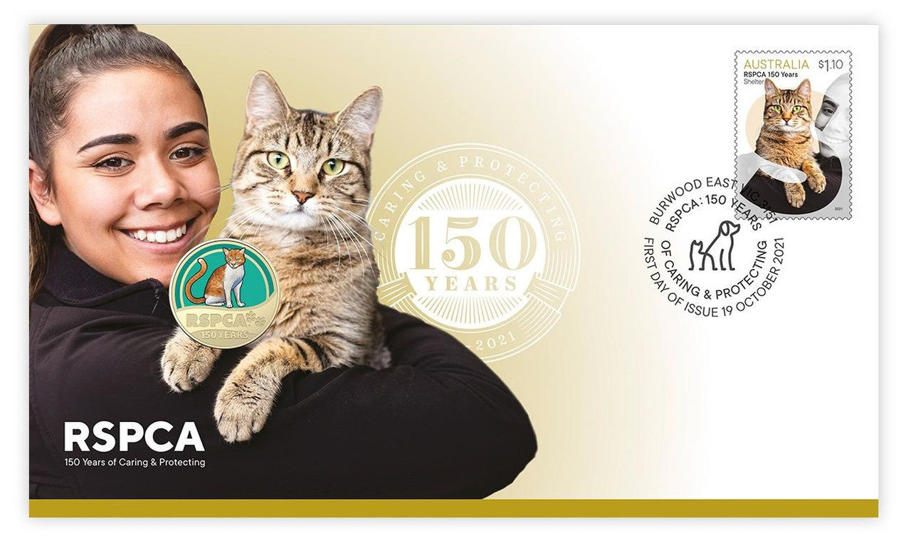 The RSPCA: 150 Years Cat postal numismatic cover is highly collectable, featuring a pictorial envelope with the $1.10 Shelter stamps from the stamp issue and a coin from the Royal Australian Mint. The stamp is postmarked - First day of issue | 19 October 2021 | Burwood East VIC 3151
