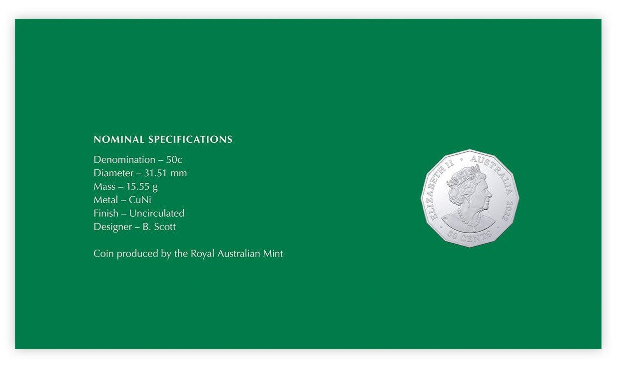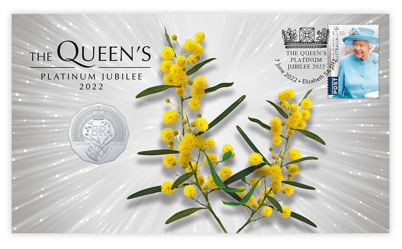 This year, 2022, marks the Platinum Jubilee of Her Majesty Queen Elizabeth II, which is a celebration of an incredible 70 years on the throne. The Queen remains the longest-reigning living monarch and becomes the only British monarch to have ruled for seven decades. The Queen also turned 96 this year. The 50c uncirculated coin presented in this cover is from the Royal Australian Mint. The design showcases Her Majesty’s monogram in the coin’s centre and at the top is St Edward’s Crown. Fanning outwards are 70 additional crowns, one for each year of the Queen’s reign. Also featured are sprigs of Lily of the Valley, which formed part of the Queen’s wedding and coronation bouquets, and Golden Wattle, Australia’s national floral emblem.