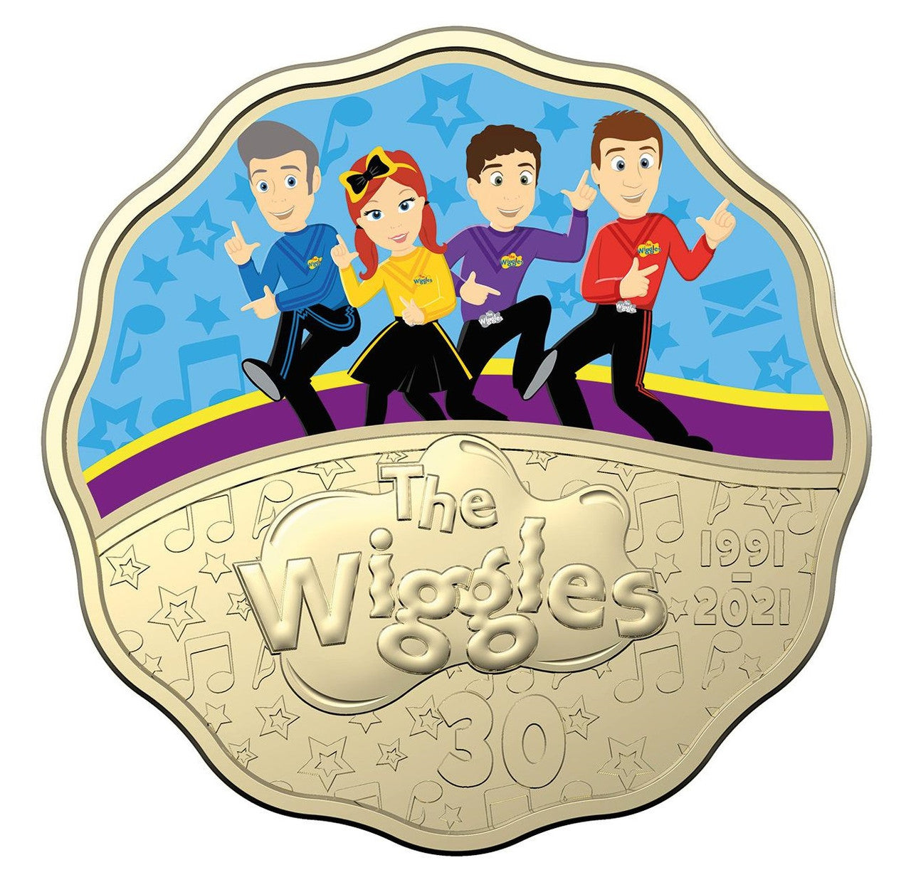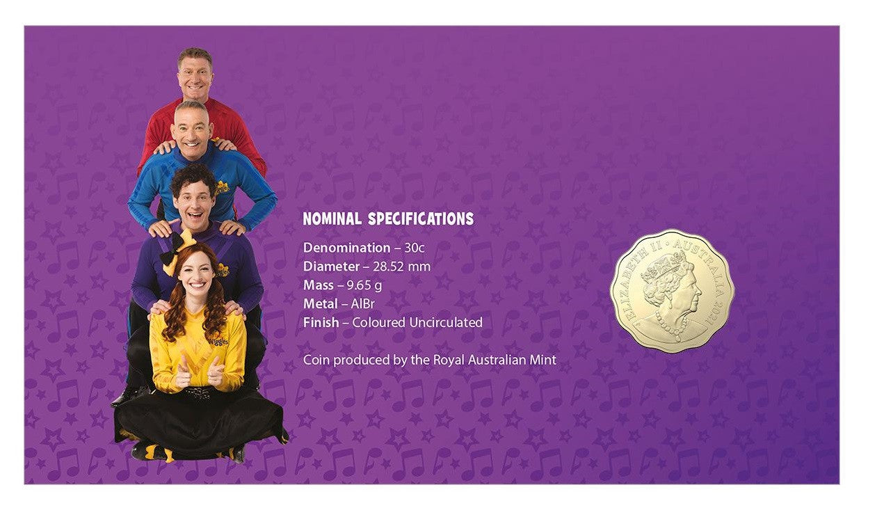 The Wiggles New postal numismatic cover conatins a scalloped-edge 30c coin, featuring a pictorial envelope with printed Wiggles MyStamp label and a coin from the Royal Australian Mint. The label is postmarked - First day of issue | 1 November 2021 | Sydney NSW 2000