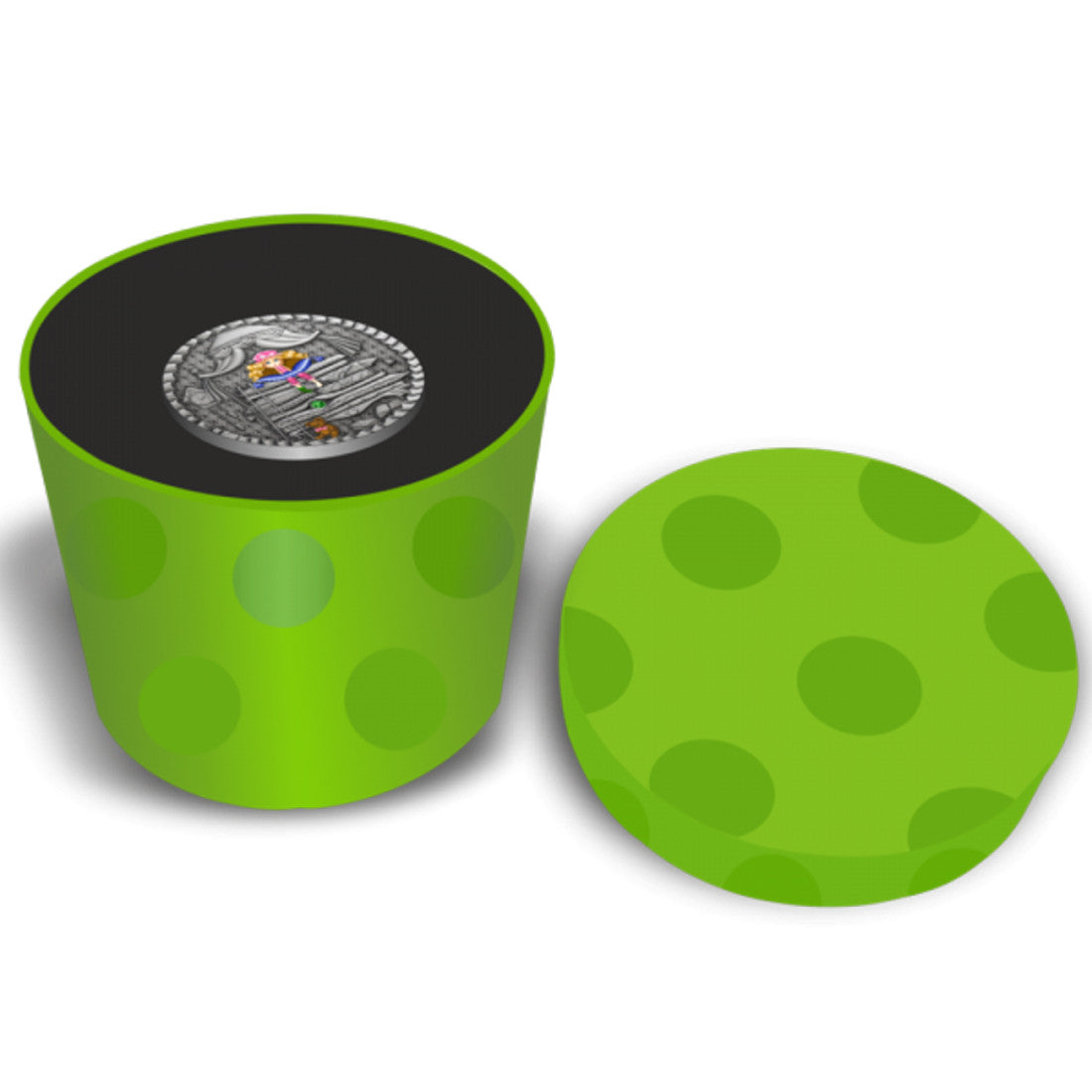 Technologies such as digital printing, antique finish and high relief were used in the production of the coin. “The Princess and the Pea” is sold in a special round white box decorated with tiny peas.
