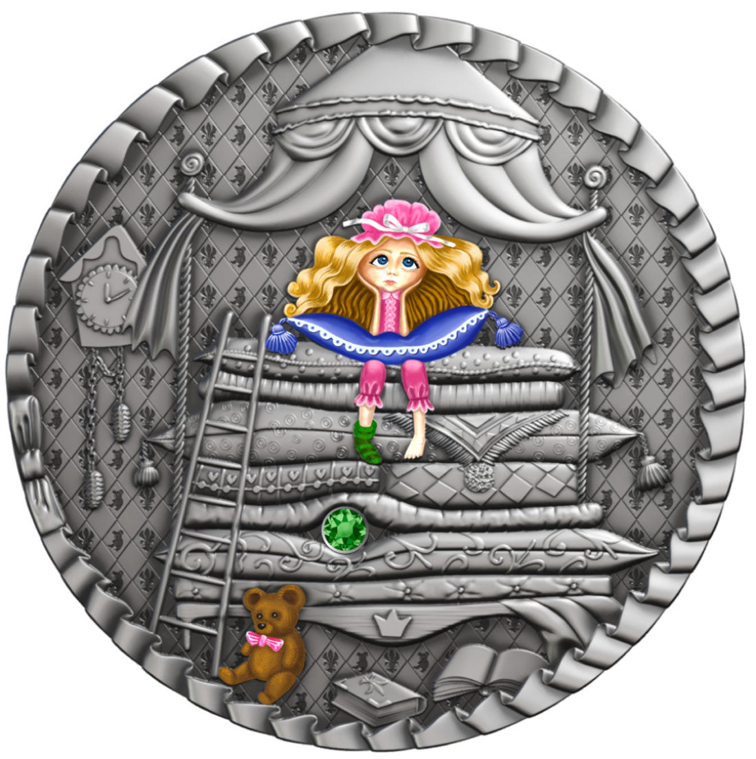 The second coin in the Fairy Tale series features a young, ordinary girl whose royal identity is established in a very ingenious way – by testing her sensitivity through a green Swarovski pea-sized stone.
