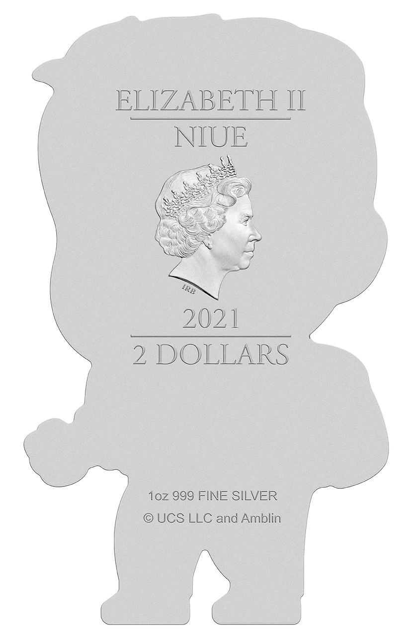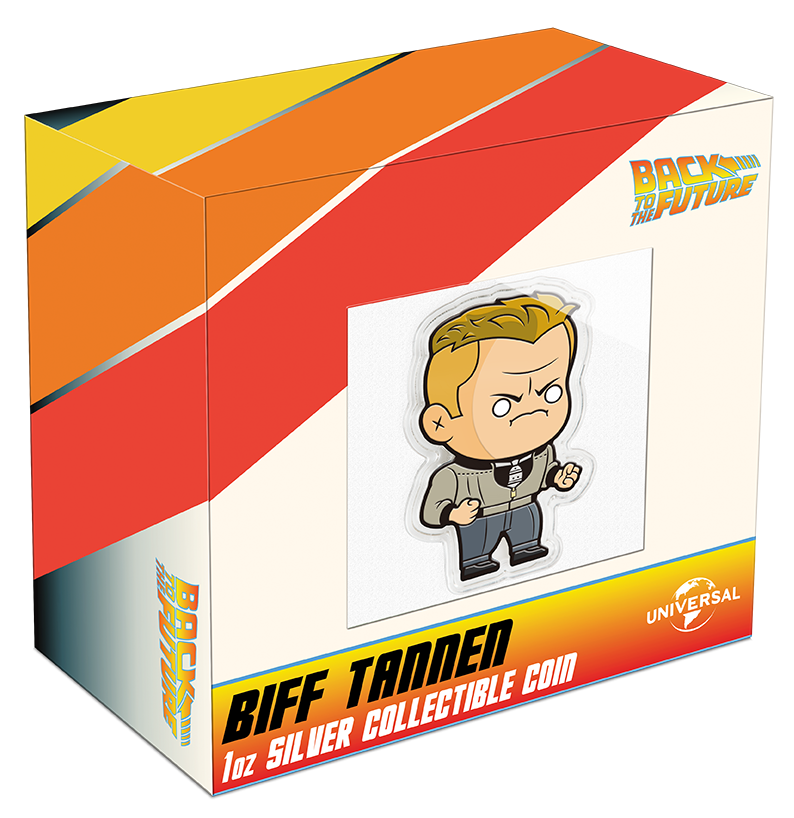 The coin’s reverse features an illustrated image of Biff Tannen, a fictional character and one of the protagonist of the Back to the Future trilogy.
