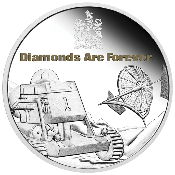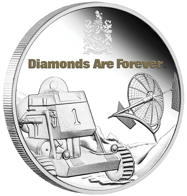 The coin’s reverse design features a moon buggy 007 uses to escape across the Nevada desert and the Bond Family Crest bearing the motto ORBIS NON SUFFICIT (the world is not enough) and the number 50, as well as the iconic diamond satellite and inscription ‘DIAMONDS ARE FOREVER’.
