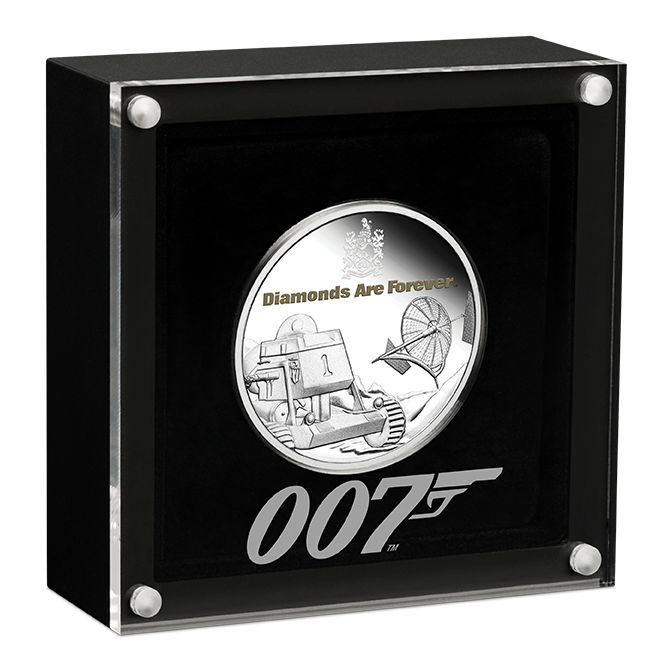 The Perth Mint will release no more than 5,000 of the James Bond Diamonds Are Forever 50th Anniversary 2021 1oz Silver Proof Coloured Coin.