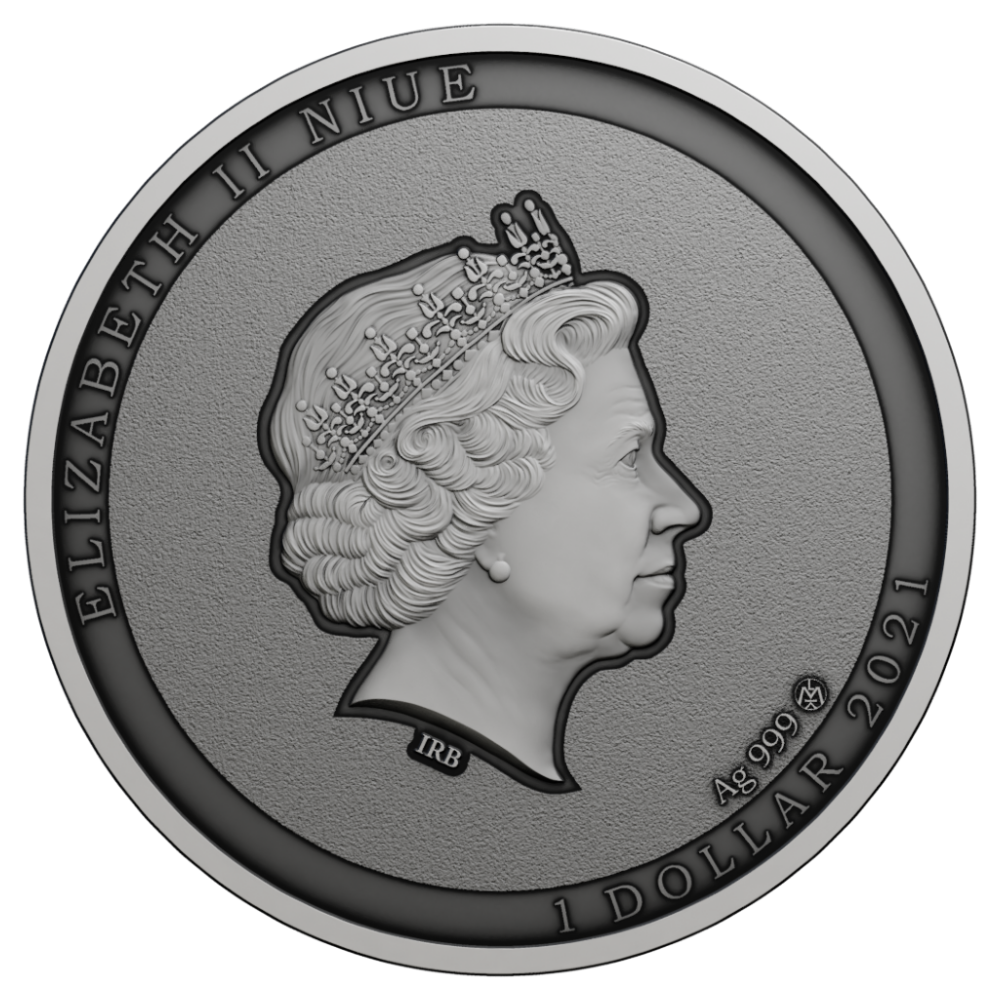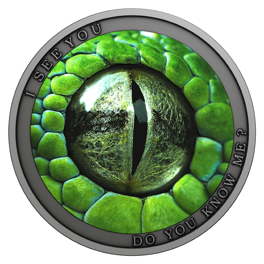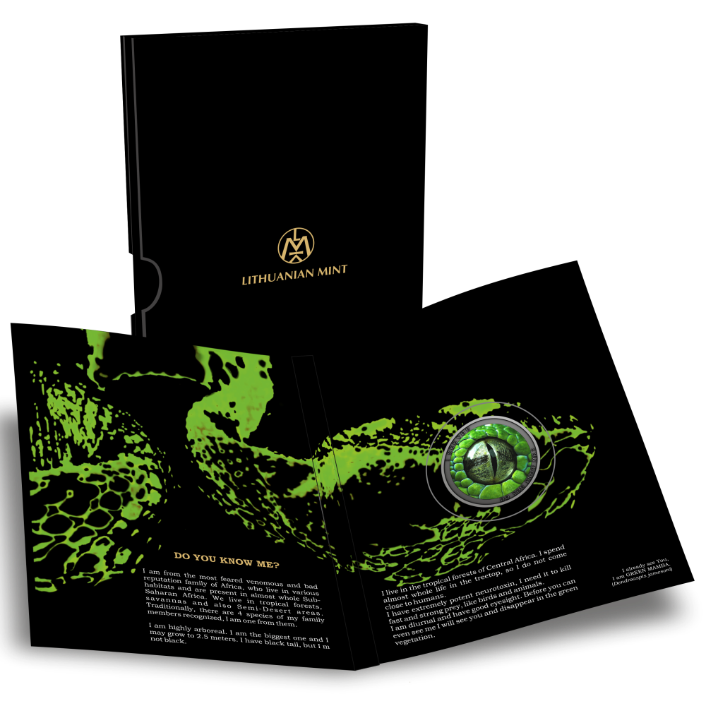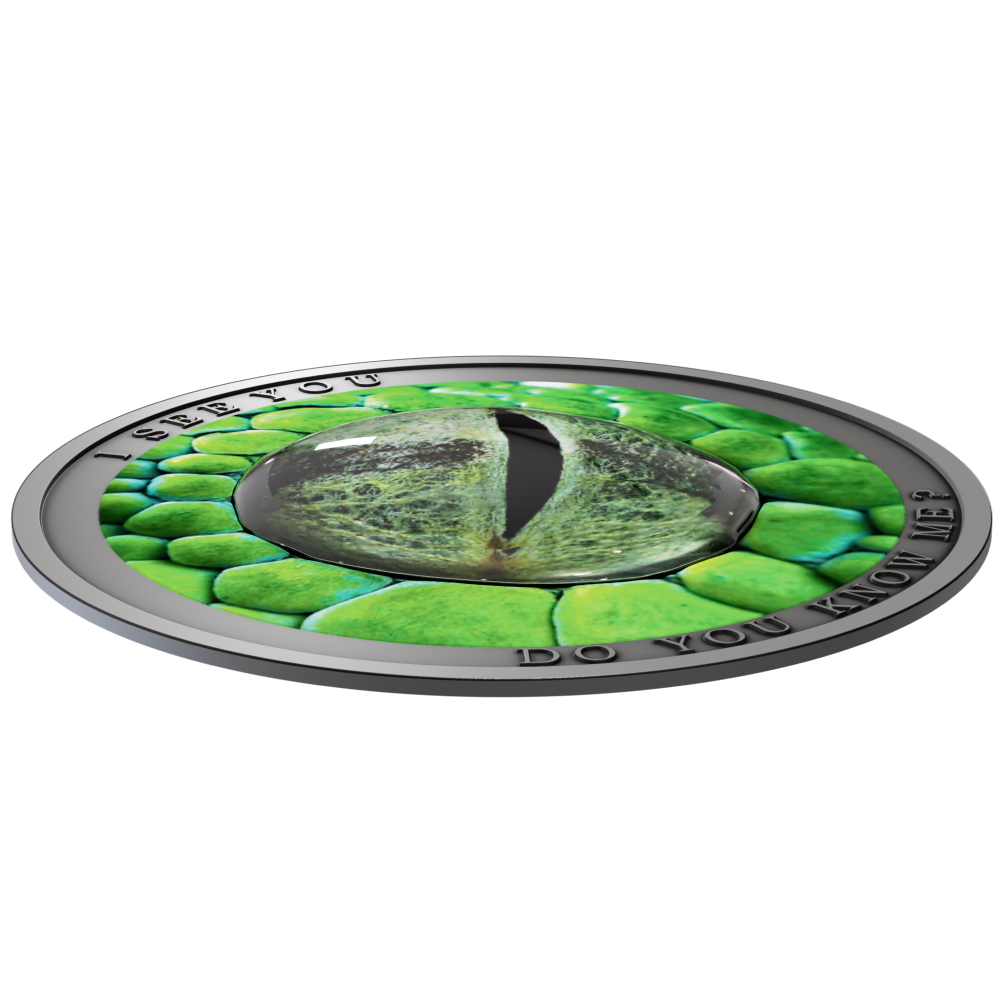 On the reverse of the coin, the eye of the green mamba, a highly venomous snake common in Africa, stares straight at you. Special technology has been used to create the appearance of the real eye – the eye is convex and the snake’s scales have mini relief.