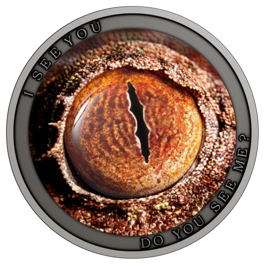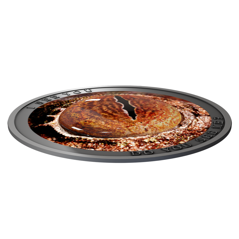 The reverse of the coin features the mesmerising eye of the satanic leaf-tailed gecko in fiery hues. A special UV varnish technology has been used to make it look realistic – the eye is convex, as if a real reptile were looking at you.