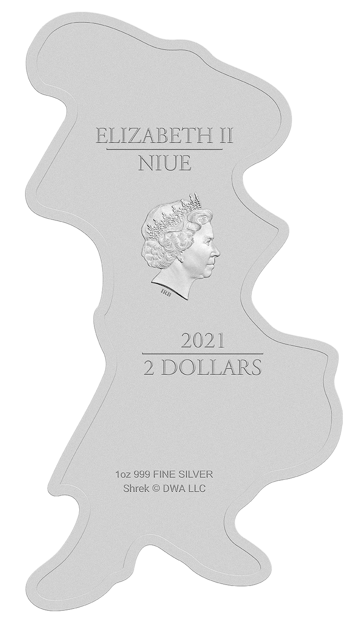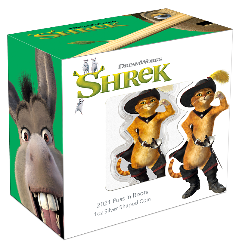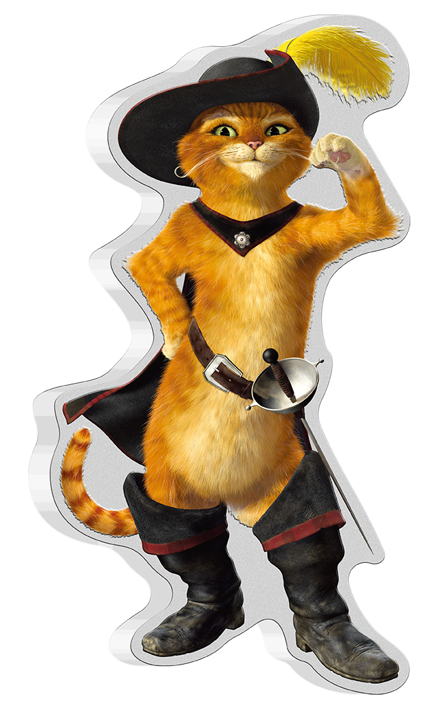 This coin is struck in a unique shape to replicate a detailed portrayal of Puss in Boots, one of Shrek’s friends in the films. Puss in Boots is loved for his wry humor and cleverness by all ages. Shrek’s other loyal sidekick, he has a swashbuckler’s bravery and romanticism in the body of a little kitty-cat. Don’t be fooled by his hilarious antics and suave façade. Beneath it all lies a loyal heart and strong sense of justice.