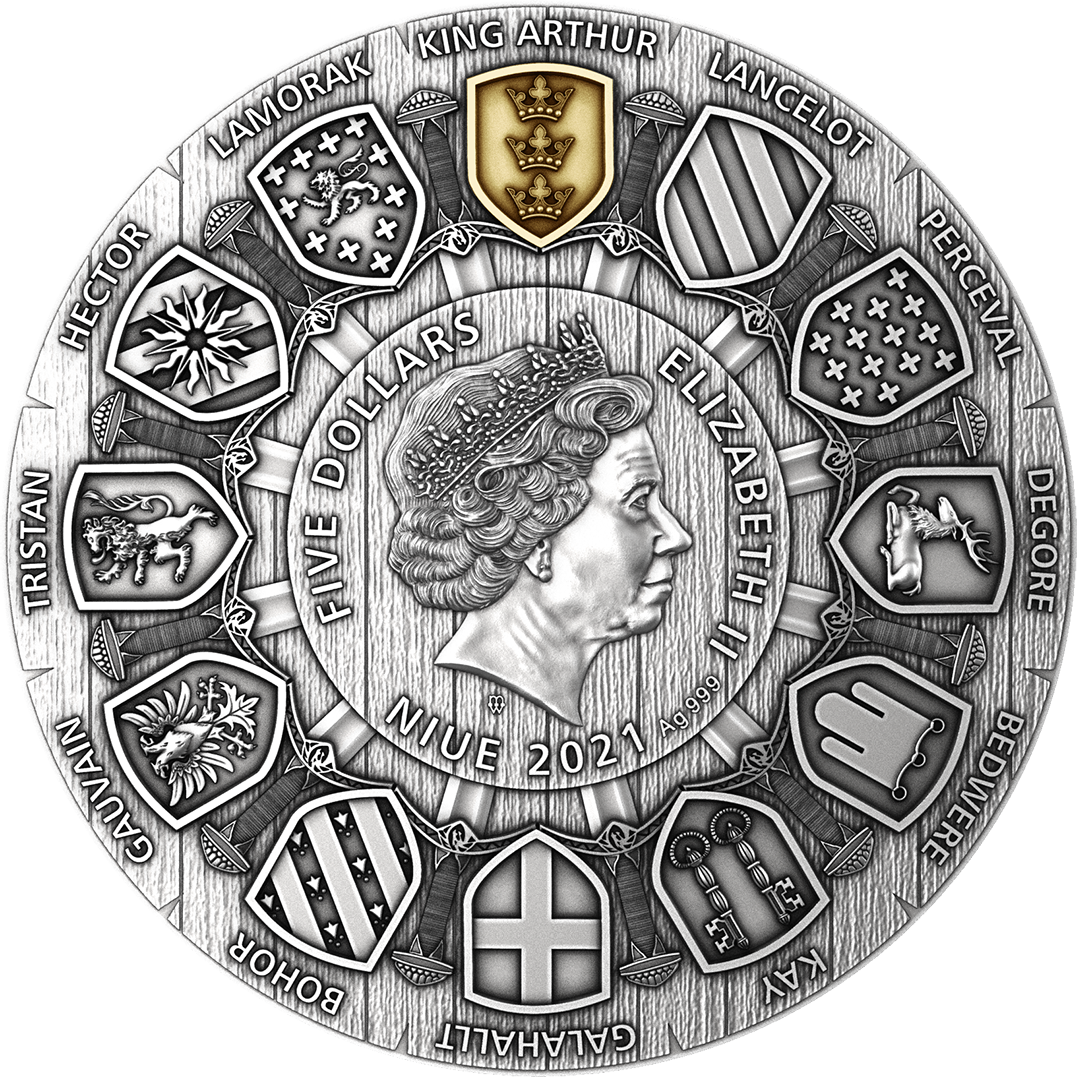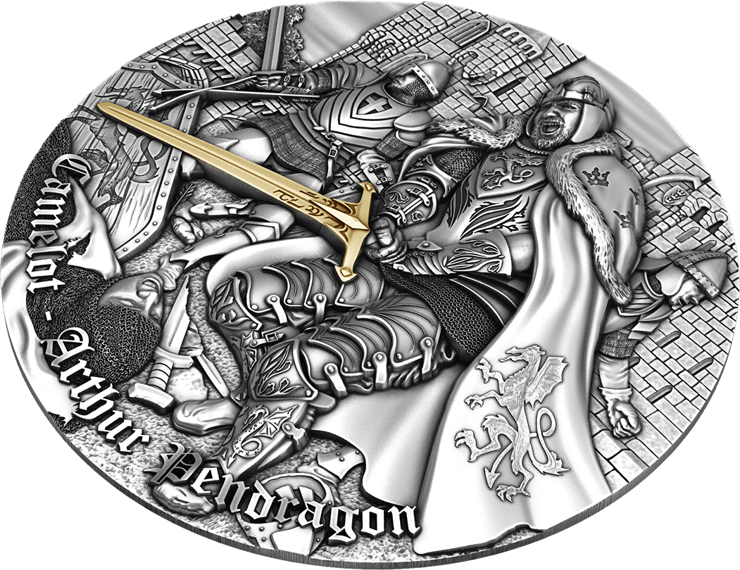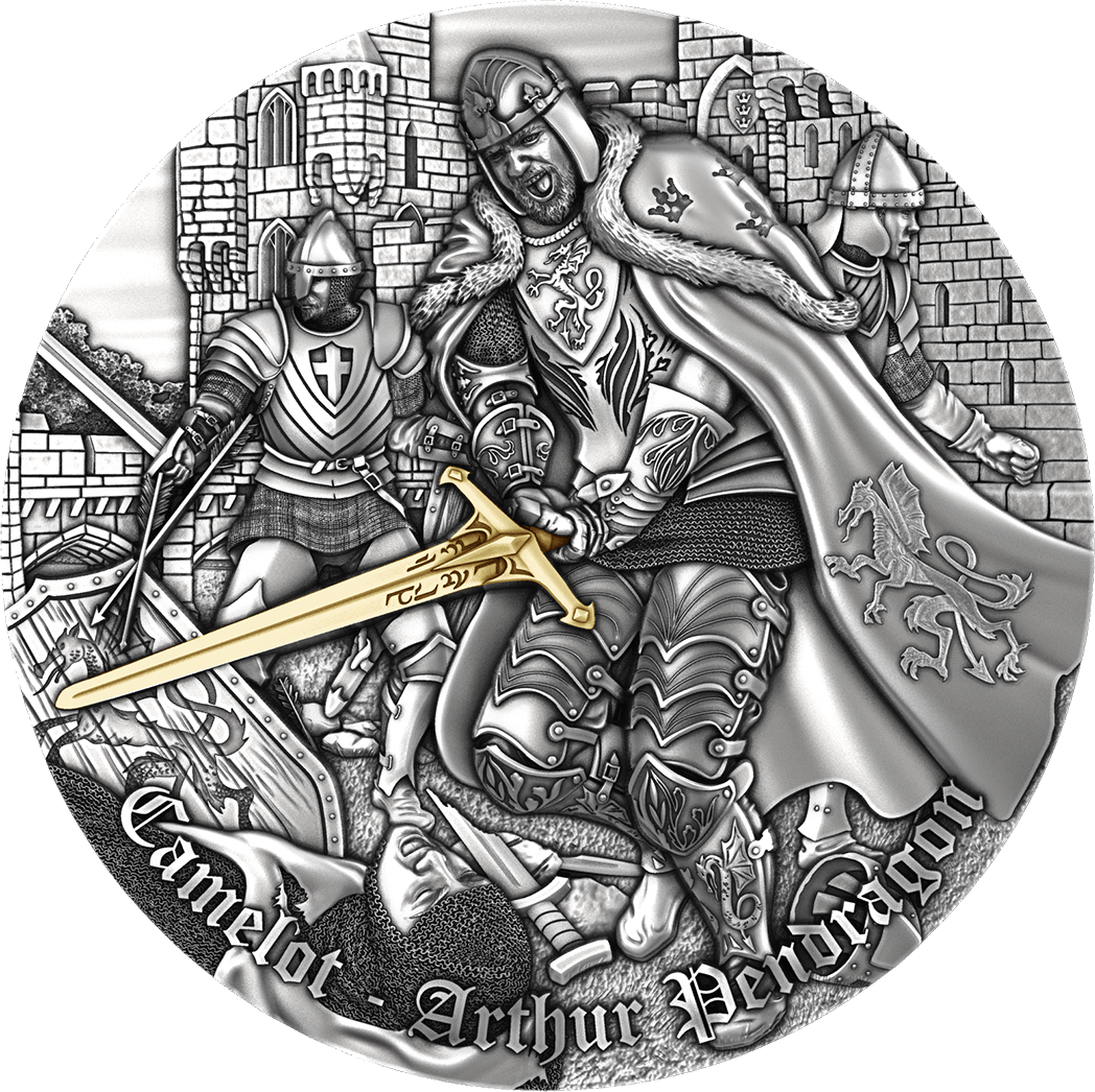 Arthur Pendragon is portrayed in stunning detail with a rimless, antique-finished and high relief .999 silver coin. The design is further complemented with select gold gilding on both faces.