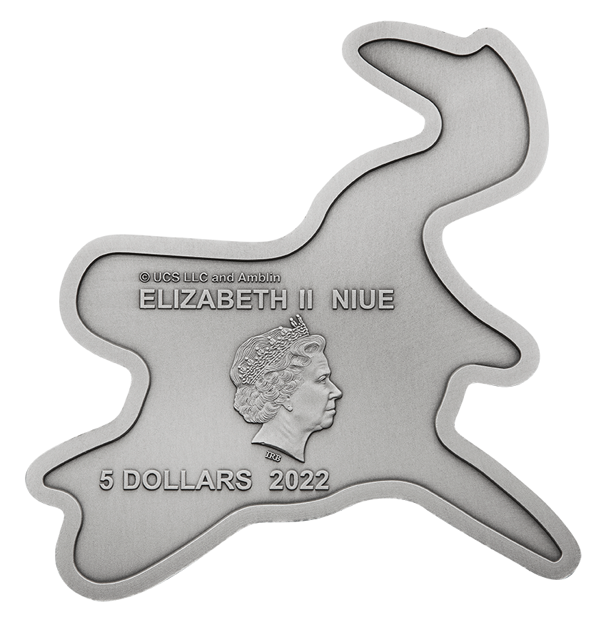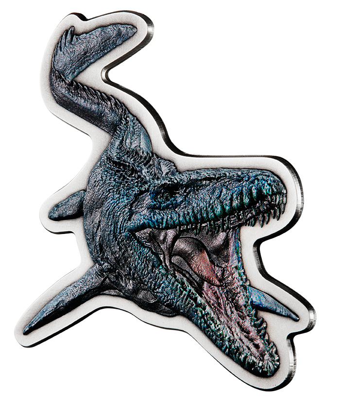 This coin is struck in a unique shape to replicate a detailed portrayal of Mosasaurus, an immense seagoing lizard – and not an actual dinosaur – she uses her fearsome array of teeth to catch fish, birds and other marine reptiles. The coin’s surface has been ‘antiqued’ by hand to give it a unique finish.