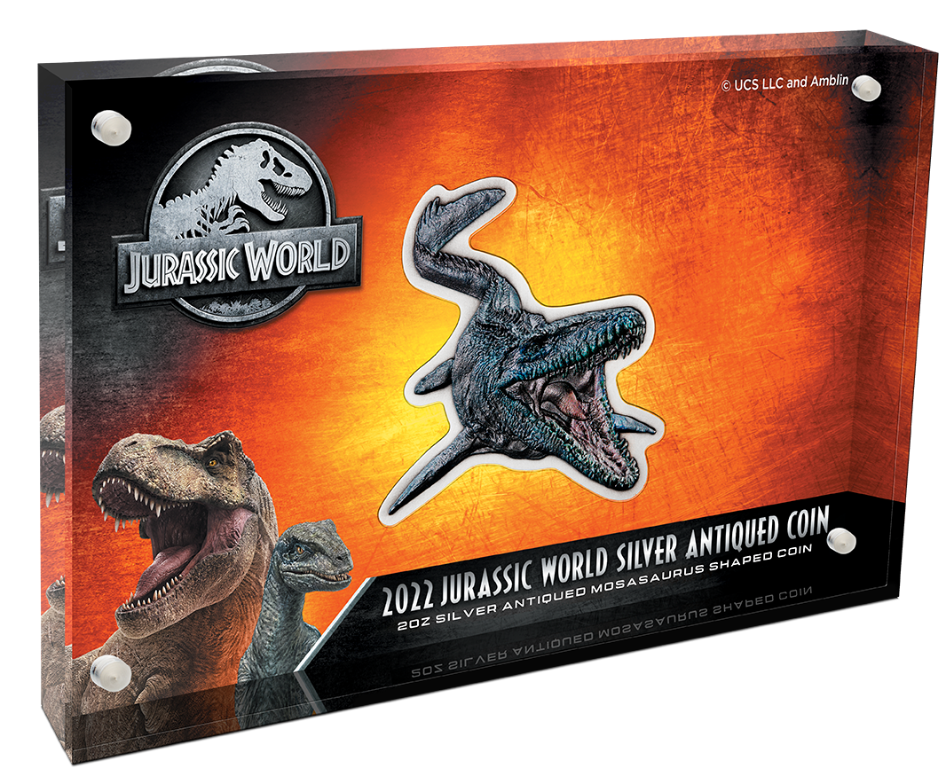 To celebrate the Jurassic World Film franchise, The Coin Company is excited to present 2022 Jurassic World 2oz Silver Antiqued Mosasaurus Shaped Coin.