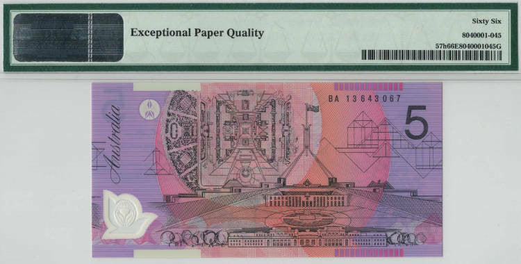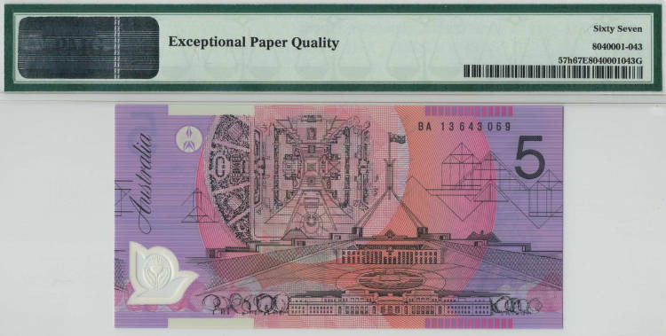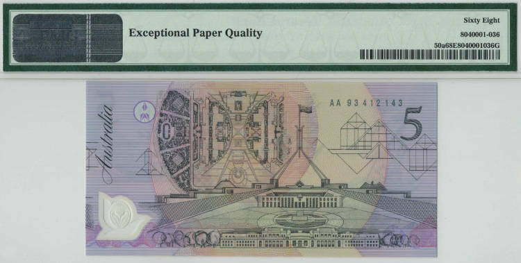 Australia Reserve Bank Polymer $5 R214 ND 1992 Fraser-Cole PMG 68 EPQ Sup Gem Unc