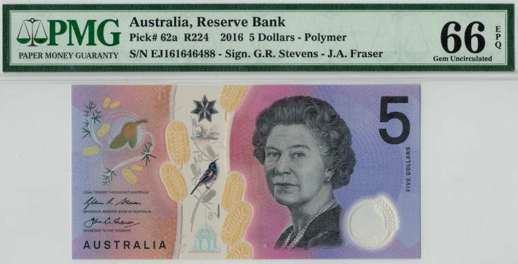 2016 Reserve Bank, $5 - Polymer, Stevens - Fraser PMG 66 EPQ Gem Unc.