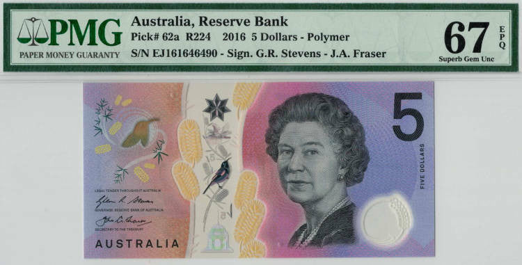 2016 Reserve Bank $5-Polymer, Stevens - Fraser PMG67 EPQ Sup Gem Unc.