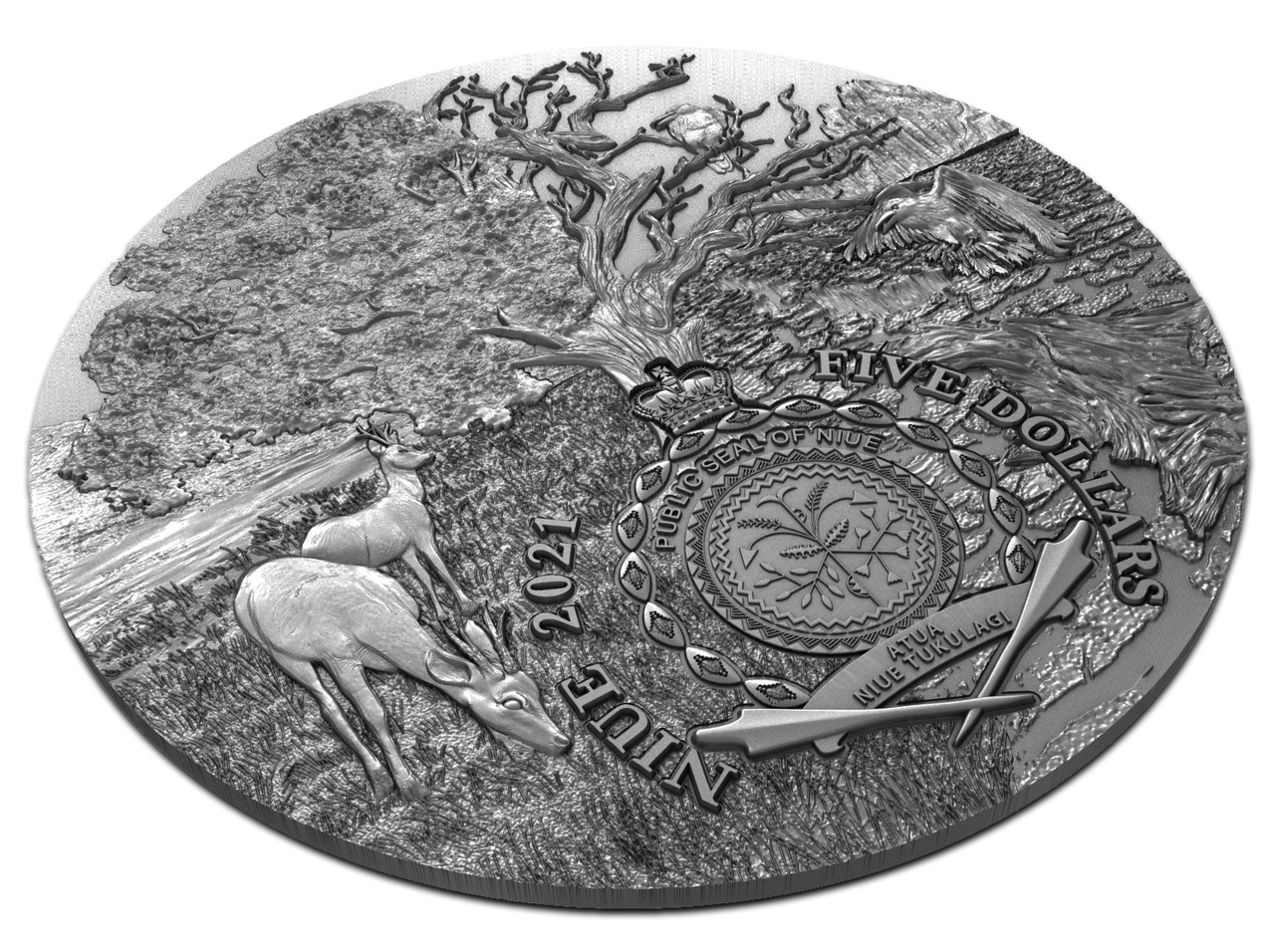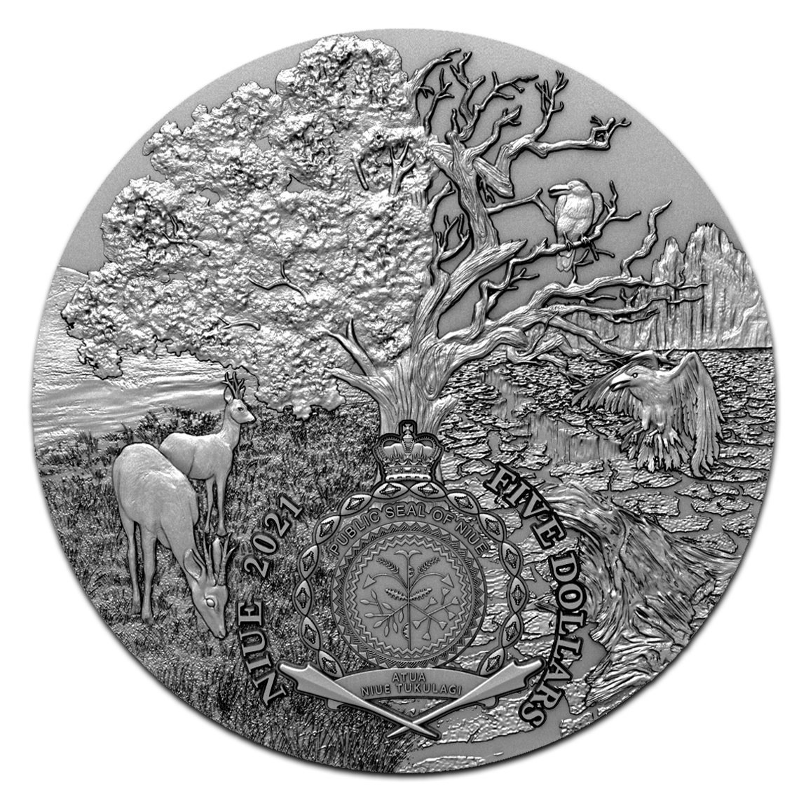 The obverse features a representation of heaven and hell, a fertile, prosperous and tranquil landscape on the left and a barren and bleak landscape on the right. The apple tree of Eden in the center, divides both antagonistic parts, good and evil, heaven and hell, leafy and full of life in its left half and dry and lifeless in its right half. Under the tree is the Public Seal of Niue crest bordered by the coin’s year of issue, 2021, and the face value, 5 Dollars.