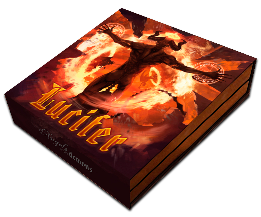 On its reverse, Lucifer is shown wielding the scepter as the ruler of hell, plated in 24k gold, with his folded wings, directing the battle against the angels, showing his superiority and pride with his head held up, watching the battle carelessly while crossing the chest without consideration of an angel. Behind Lucifer, a soldier from heaven and another from hell have an aerial sword fight.