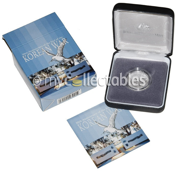 The 2003 fine silver proof coin commemorates the 50th Anniversary of the end of the Korean War (1950-1953), and honours the memory of those who died, as well as honouring those who sereved in the war until the withdrawal of Australian Forces in 1957.