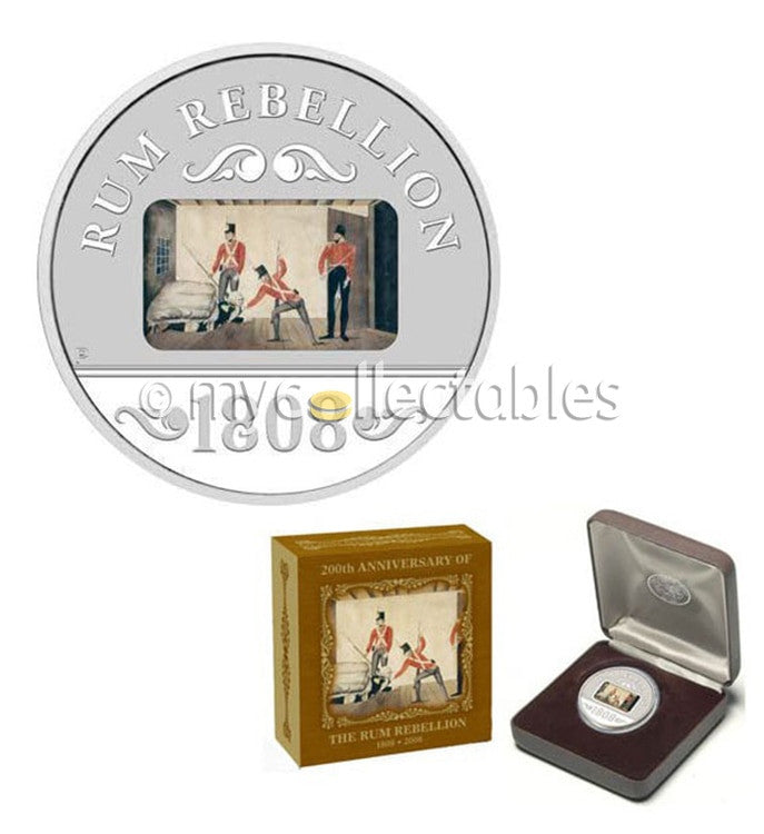 The Dump is surrounded by a Holey Dollar featuring the inscription RUM REBELLION and the year-date 1808, as well as The Perth Mint’s ‘P’ mintmark.