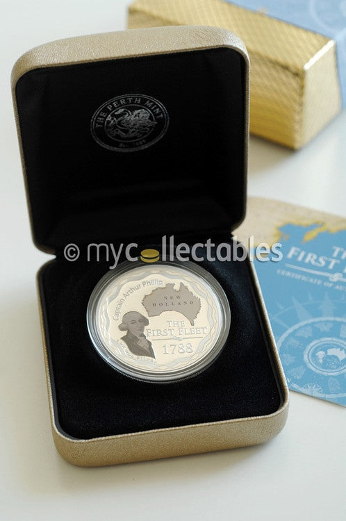 The coin's coloured reverse, which incorporates The Perth Mint's "P" mintmark, partrays Governor Arthur Phillip and an outline of the Australian continent containing the words NEW HOLLAND. The design, which also includes the inscription THE FIRST FLEET 1788, appears within a circular border of stylised waves.