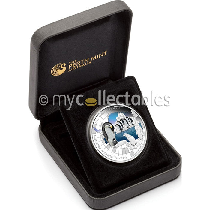 The coin’s reverse depicts a coloured image of Emperor Penguins and two chicks standing on ice floes, which appear within the outline of Antarctica. The Perth ‘P’ mintmark is included in the design.