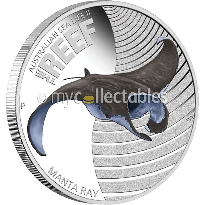 The coin’s reverse depicts a Manta Ray in colour and includes The Perth Mint’s ‘P’ mintmark. Incorporated into the design are the inscriptions AUSTRALIAN SEA LIFE II – THE REEF – MANTA RAY.