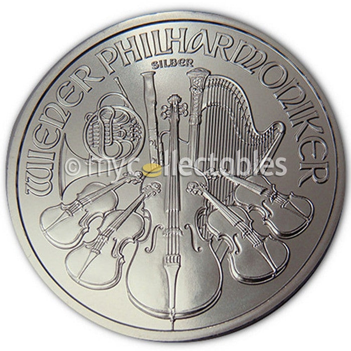 With striking attention to detail and flawless execution, the 2011 Austrian Philharmonic 1 oz silver coin commemorates the country's tradition of fine music and exquisite numismatics. Etched from 0.999 fine silver, this 2011 Austrian Philharmonic coin is stunningly elegant. On the coin's obverse is a lovely rendering of the famous great organ, in Vienna's fabled Golden Hall. The reverse of the 2011 Austrian Philharmonic features a brilliant display of musical instruments. Bring an exquisite blend of fine arts to your collection with the silver 1 oz 2011 Austrian Philharmonics coin.