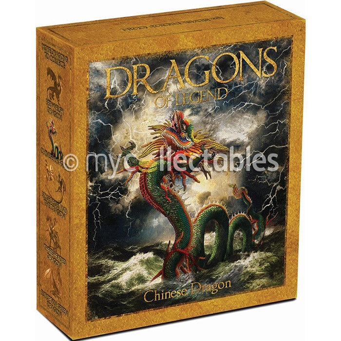 Designed from an original illustration by Howard David Johnson, the coin’s reverse portrays a coloured portrait of a Chinese dragon rising from the sea, set against a dramatic skyline. Included in the design are the words CHINESE DRAGON and the monetary denomination.