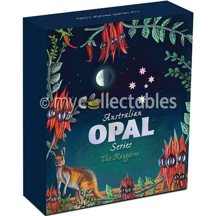 The coin’s reverse incorporates an inner panel design of a kangaroo detailed in pure Australian opal. The outer panel of the coin depicts Sturts Desert Pea leaves and blossoms, a first crescent moon and the Southern Cross – a renowned star group which is only visible in the Southern hemisphere.