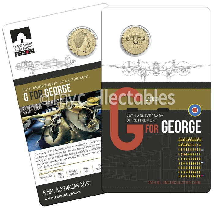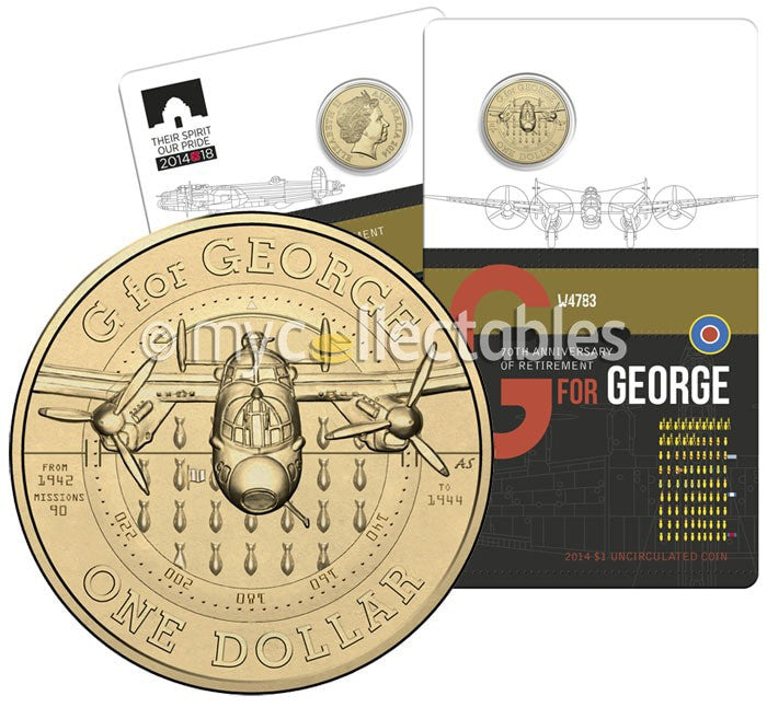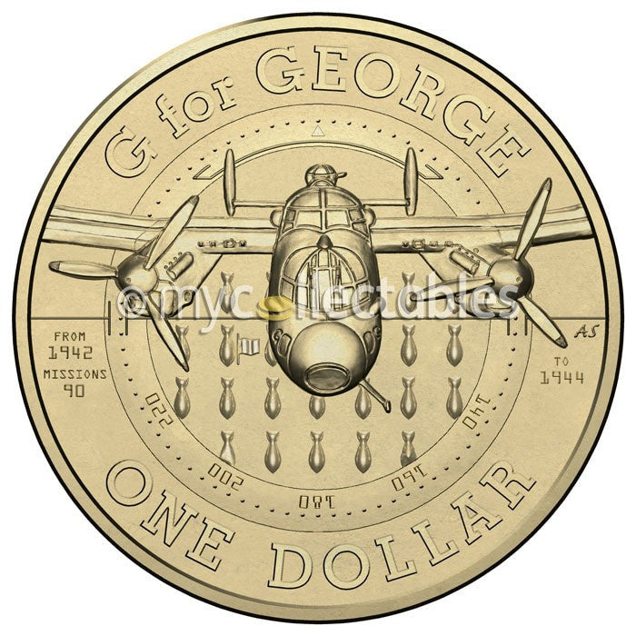 • Coin’s reverse features ‘G for George’ against a background of missiles dropped by the plane