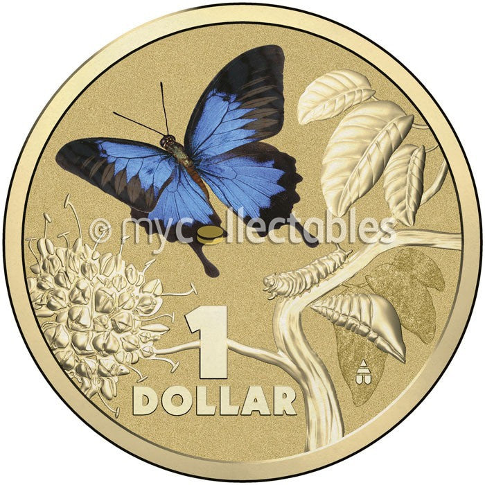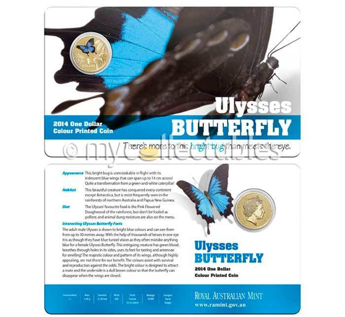 2014 $1 Colour Printed Frosted Uncirculated Coin - Ulysses Butterfly - Bright Bugs Series