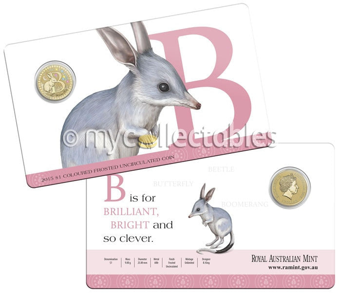 2015 $1 Colour Printed Frosted Uncirculated Alphabet Collection Letter B Coin