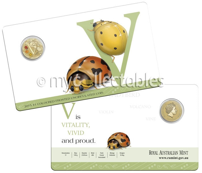 2015 $1 Colour Printed Frosted Uncirculated Alphabet Collection Letter V Coin