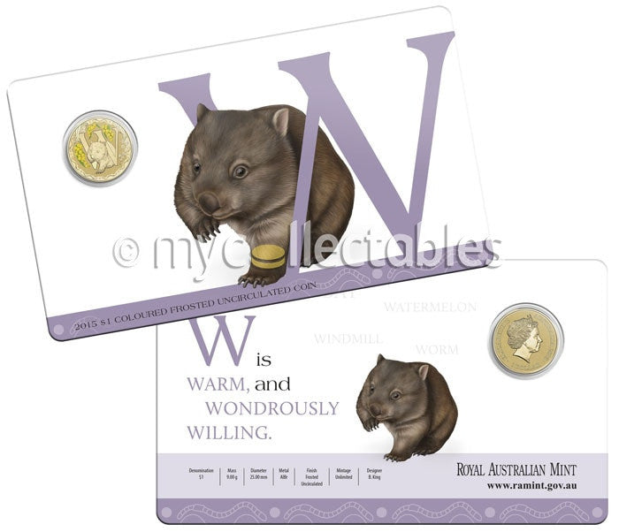 The Letter W Coin features the warm and wondrously willing Wombat, playfully interacting with the Letter W. Then unleash your inner detective to see if you can find the cleverly hidden objects on the coin!