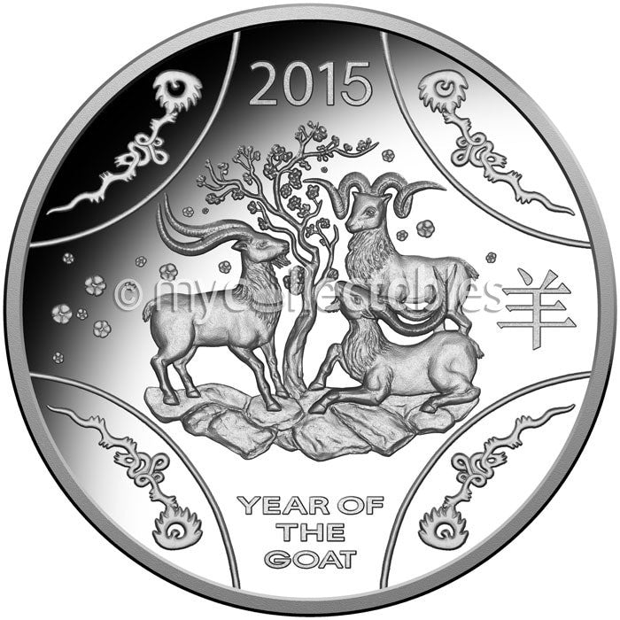 The 2015 Lunar Year of the Goat coins feature three goats surrounding a plum blossom tree.