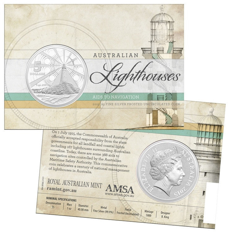 2015 $5 Fine Silver Frosted Unc Coin -Australian Lighthouses- Aids to Navigation