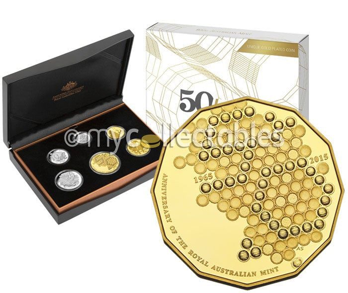 The annual tradition of year sets of Australian coins continues and in 2015 marks a very special milestone for the Mint. On Royal Australian Mint's golden anniversary, this proof set celebrates 50 years of producing coins which have been collected and cherished by generations of Australians.