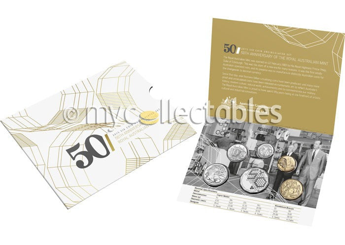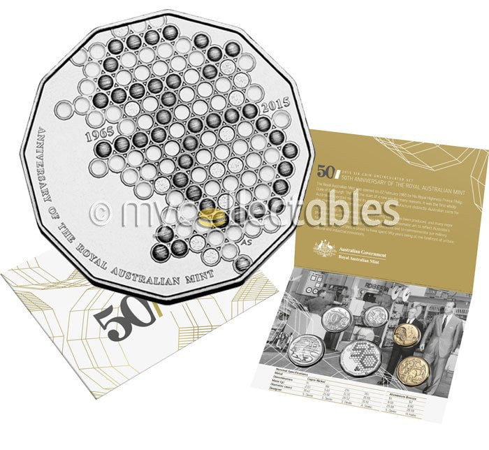 The annual tradition of year sets of Australian coins continues and in 2015 marks a very special milestone for the Mint. On Royal Australian Mint's golden anniversary, this uncirculated set celebrates 50 years of producing coins which have been collected and cherished by generations of Australians.