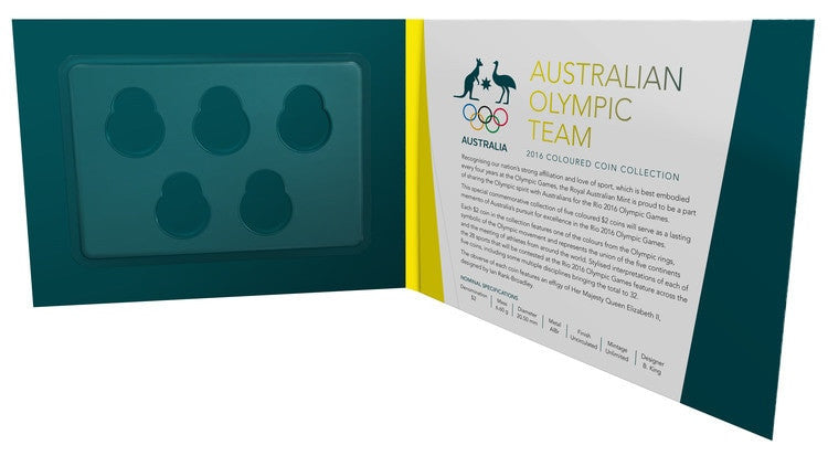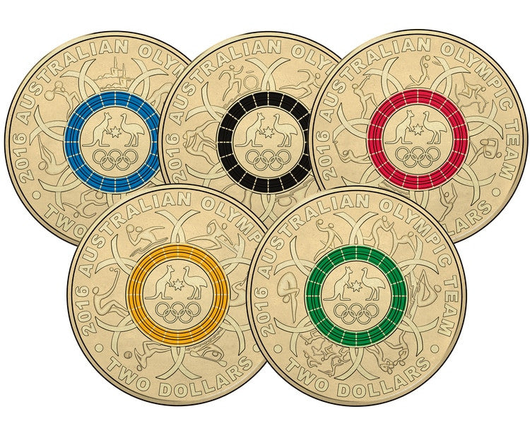 • This special commemorative collection of five coloured $2 coins will serve as a lasting memento of Australia’s pursuit for excellence in the Rio 2016 Olympic Games.