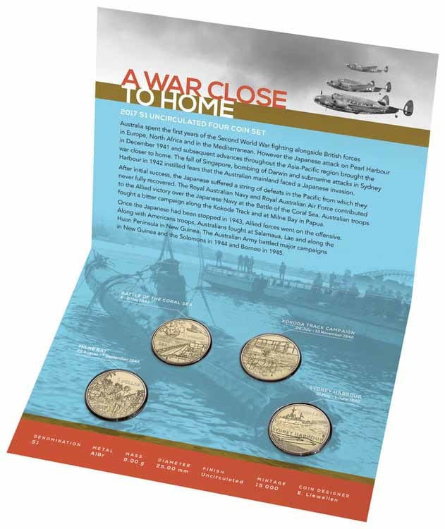For Australia, the first years of the Second World War were spent fighting alongside British forces in Europe, North Africa and in the Mediterranean. Japanese attacks on Pearl Harbor in December 1941 and subsequent advances throughout the Asia-Pacific region brought war much closer to home than ever before. The fall of Singapore followed by the bombing of Darwin and submarine attacks in Sydney Harbour in 1942, confirmed that our homeland was a strategic target for Japanese forces in the region.Fighting back, many Australian servicemen and women helped stop the advance of Axis powers in the Pacific. Honouring the memory of these events with commemorative coins, the Royal Australian Mint proudly announces the release of the four coin set – A War Close to Home.