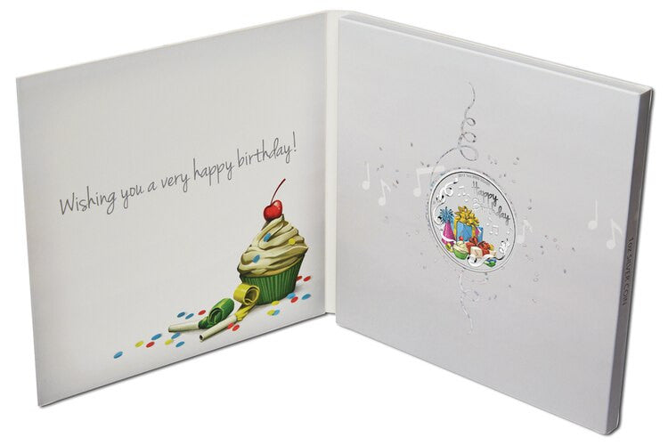 The Happy Birthday coin is housed in a square shaped illustrated presentation card that opens to reveal the coin and space to write a birthday message inside. The coin is also accompanied by a numbered Certificate of Authenticity.
