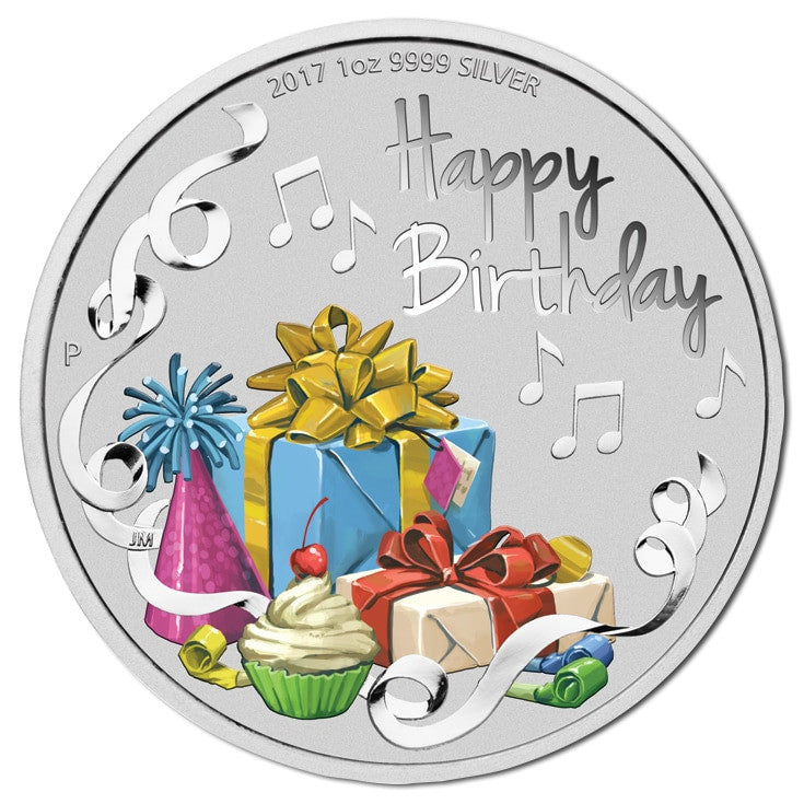 The coin's reverse design features two birthday gifts, a party hat, streamers, and a cake in colour, along with musical notes. The design includes the inscription ‘Happy Birthday’, the year-date, and The Perth Mint’s traditional ‘P’ mintmark.
