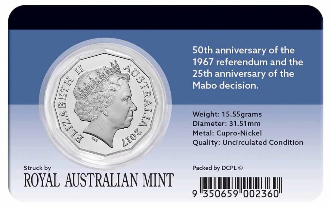 This important commemorative 50c coin honours two critical moments in Australia's history with a one-year-only legal tender type. Issued in 2017, it commemorates the 50th anniversary of the 1967 Referendum, and the 25th anniversary of the historic Mabo land rights case.