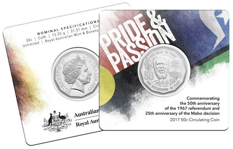 In National Reconciliation Week 2017, the nation celebrates the 50th anniversary of the 1967 referendum and 25th anniversary of the Mabo decision. Created in collaboration with Boneta-Marie Mabo, an award-winning contemporary artist and Eddie ‘Koiki’ Mabo’s granddaughter, this silver proof coin includes a bonus 50 cent circulating coin.