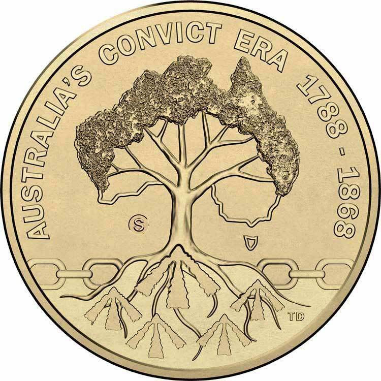 • Coin’s reverse features an artistic depiction of a tree with a canopy representing Australia, with the convict symbols of the Broad Arrow and chains at its roots
