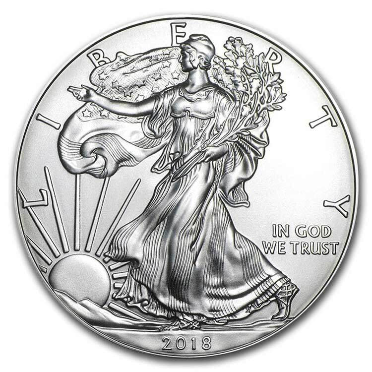 On the front of the coin is the Lady Liberty design by Adolph Alexander Weinman, an American sculptor. Here the lady is wearing an American flag while the sun rises behind her, with the word LIBERTY emblazoned along the top of the coin. Behind her leg is the phrase ‘In God We Trust’ and at the base of the coin is the year’s date – 2018.