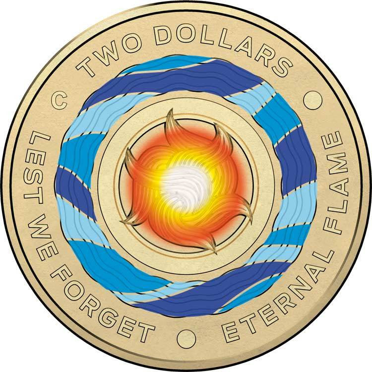 During the Anzac Centenary period the Mint continues its tradition of releasing coloured $2 ‘C’ Mintmark coins to commemorate those who have made the ultimate sacrifice for their country. This striking and evocative design is inspired by the Eternal Flame at the Australian War Memorial. Suspended above the Pool of Reflection, the flame is symbol of remembrance and sacrifice.
